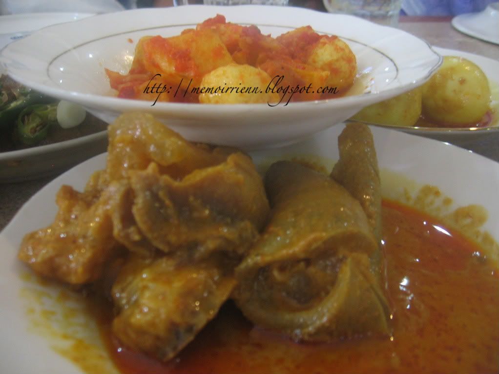 Antara menu menarik di Restoren Minang adalah kari kulit dan otot lembu (gambar di bawah ni). Cara mereka hidang makanan tompok-tompok, sikit-sikit tapi banyak. hampir semua pedas nasib ada lauk yang tidak pedas untuk Danish. Sayur dalam banyak-banyak ni cuma satu jenis, tak silap saya daun ubi celur dengan samabal. Yang lain semua lauk.